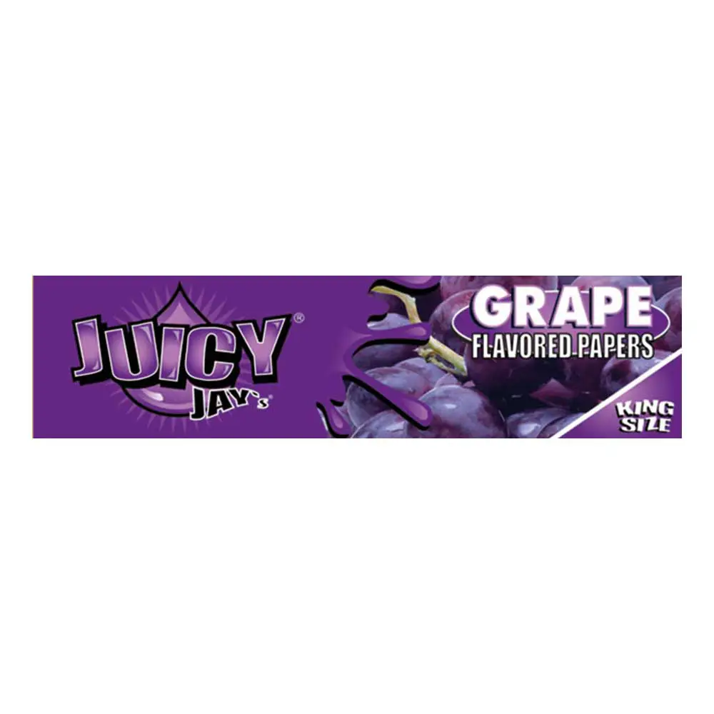 Product Type: Grape King Size Slim Contents: 32 leaves per pack Price: €1,50 per pack Display: 24 packs per box Key Features: • Infused with Juicy® Jay’s® triple-dipped flavoring • Slow production process for enhanced sweetness • Smooth smoking experience Warning: Smoking is harmful. 18+ only.
